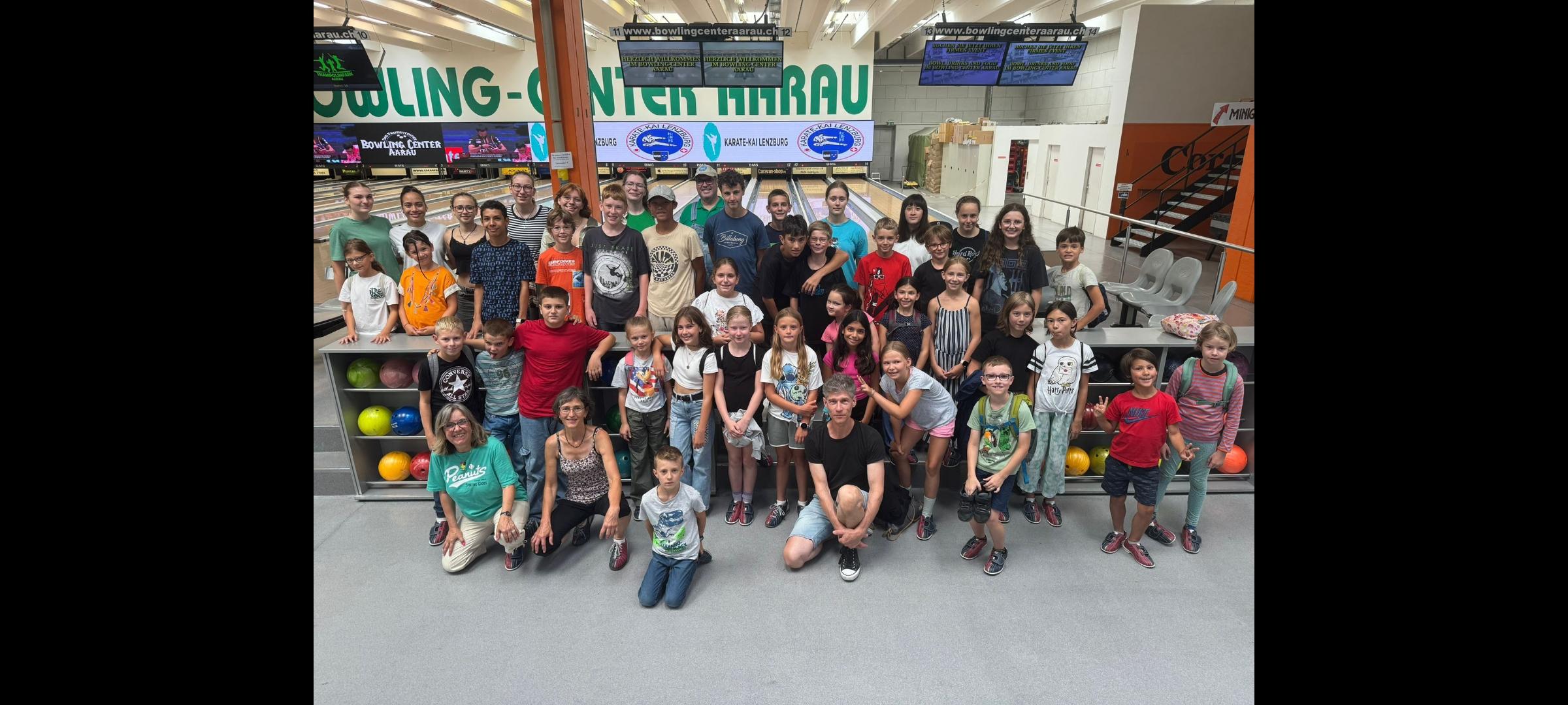 41 Junge Karatekas und 5 Jugendtrainer trafen sich am Samstag 17. August 2024 am Morgen in Lenzburg und machten sich mit dem Zug auf den Weg nach Aarau. Das Ziel: Das Bowling Center Aarau. Auf 8 Bahnen konnte man sich mit seinen Trainingskollegen zur Abwechslung nicht in der Turnhalle messen, sondern beim Bowling. Es wurde Kugel um Kugel nach vorne gerollt und mit jedem Durchgang steigerten sich die Kids (manchmal mehr manchmal weniger 🙂 ). Jedenfalls durften am Schluss der Bowlingsession die Kids durchaus zufrieden und vor allem hungrig, in Richtung Altstadt Aarau aufbrechen. Nach dem aktiven Teil wurden wir nämlich mit Pasta & Glace belohnt. Um 14:30 Uhr kehrten wir mit vollem Magen und glücklich nach Lenzburg zurück. Am Bahnhof Lenzburg angekommen, folgte dann noch eine weitere Überraschung, jeder Teilnehmer bekam aufgrund des Vereinsjubiläums noch ein tolles und nützliches Geschenk überreicht. Dankbar schauen wir auf einen erfolgreichen Event zurück.