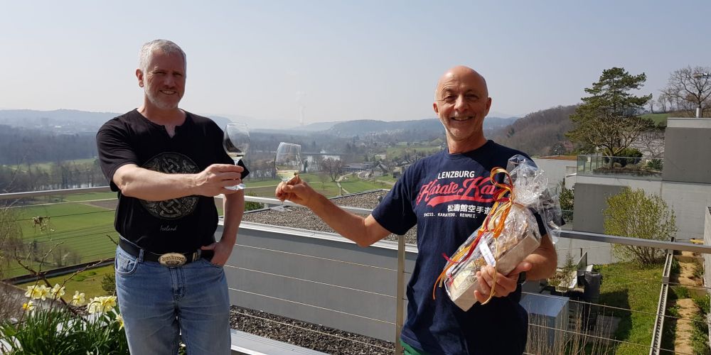 Eigentlich wollten wir unsere Vieltrainierer 2019 bereits früher ehren, aber verschiedene Umstände zwangen uns dazu, dies aufzuschieben und schliesslich mussten wir aufgrund der Coronavirus-Pandemie das Dojo schliessen. Bis heute hütete ich die Geschenke für Walter Bänziger (86% Trainingsbesuche), Judith Jörger (75% Trainingsbesuche) und Kurt Sutter (70% Trainingsbesuche). Aber was macht man nun mit drei Geschenken für die Trainings-Champions des letzten Jahres, wenn das Dojo auf Wochen hinaus geschlossen ist? Man geht sie besuchen, genau das habe ich am 28. März getan und fand drei topmotivierte Karatekas in ihrem Zuhause vor.