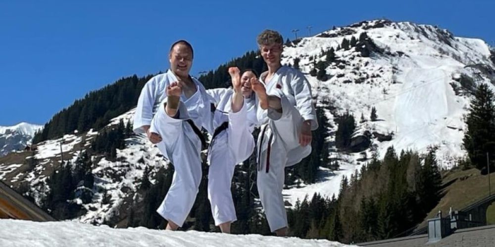 Das erste Training liess dann auch nicht lange auf sich warten und schon flossen die Schweissperlen das erste Mal zwischen Haut und Gi hinunter. Die Trainings waren insgesamt interessant und lehrreich. Als Special-Event galt natürlich Kens Trainingseinheit, vermochte er doch unseren Karatekas wieder einmal ein Training ganz nach japanischem Gusto zu vermitteln. Nach dem letzten Training am Samstag verblüffte Sonja mit folgender Idee: “Wir könnten mit Ken noch aufs Schilthorn, oder zumindest bis zur Zwischenstation fahren und eins trinken gehen.” Dort angekommen und nach erfolgtem Trailbesuch versuchten wir vergeblich, die Tür zur Beiz zu öffnen… Alles dunkel und seelenruhig. Geschlossen. Flexibel wie Bündner im Berner Oberland sind, fuhr uns kurzerhand ein Bahnangestellter aufs Schilthorn, wo wir gemütlich mit Ken noch unser langersehntes Trünkli schlürfen konnten.