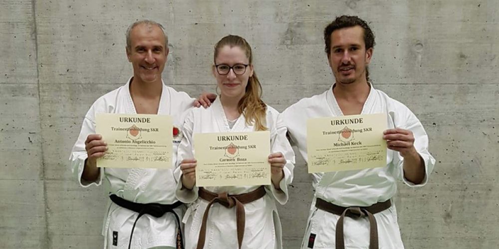 Unsere drei Mitglieder Toni Angelicchio, Migi Keck und Carmen Boza haben erfolgreich die Trainer-Basisausbildung unserer Stilsektion Swiss Karatedo Renmei (SKR) mit dem Zertifikat abgeschlossen. Diese Ausbildung dauerte zwei Jahre und umfasste insgesamt sechs Module. Damit hat unser Klub nun eine stattliche Zahl Mitglieder, welche das Zertifikat der SKR-Trainerausbildung erhalten haben: