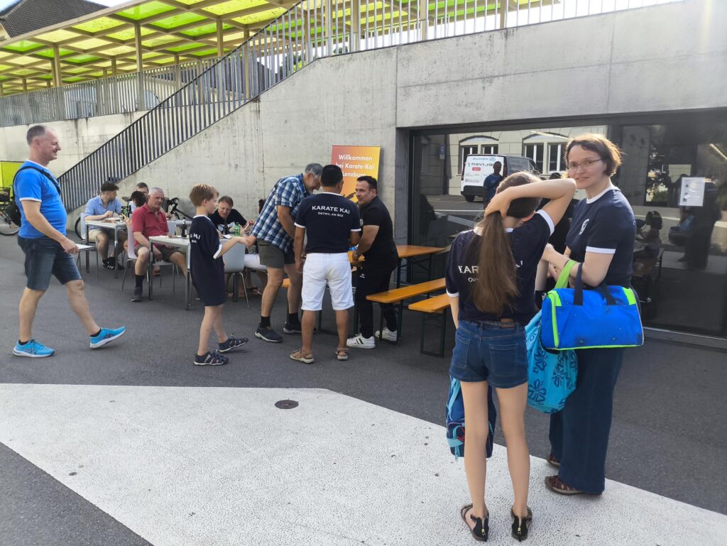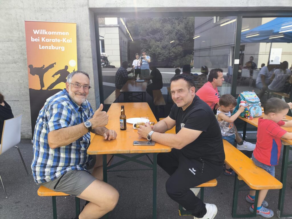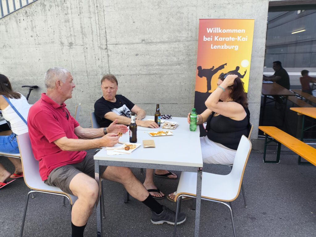 Der Sommer ist da und zeigte sich von seiner heissen Seite beim Eventtraining mit Marc Stevens und dem anschliessenden Grillfest. Bei heissen Temperaturen um die 30 Grad füllte sich die Turnhalle am Samstag Nachmittag, je länger je mehr. Sensei Peter konnte einen ganz besonderen Gast für unser Grillfest organisieren. Es war dies, Marc Stevens, 6. Dan, mehrfacher belgischer Meister und über fünfzehn Jahre in der belgischen Nationalmannschaft. Marc trainierte lange Zeit unter Sensei Kase und Sensei Shirai. Heute wohnt Marc in der Schweiz und unterrichtet auch im Karate Kai Basel. Mit nur wenigen Techniken aber einigen Drehungen und Wendungen schaffte es Sensei Marc nicht nur den Körper ins schwitzen zu bringen sondern auch unseren Geist. Natürlich kamen auch die Anwendungen der Techniken mit dem Bezug zu den Kata nicht zu kurz und so wurde das zuvor noch geübte dann im Partnertraining angewendet und geübt. Marc konnte dies sehr eindrucksvoll demonstrieren. Alles in allem ein sehr spannendes Training das grosse Begeisterung fand. Nach dem Schwitzen durften wir zum gemütlichen Teil über gehen und uns bei Speis und Trank vor der Turnhalle verwöhnen lassen.
